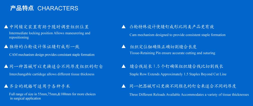 直線切割吻合器(qì),一(yī)次性直線切割吻合器(qì)是(shì)在組織上(shàng)擊入成直線排列的(de)四排互相(xiàng)交錯(cuò)的(de)縫釘,組件(jiàn)內∞(nèi)的(de)切割刀(dāo)同步将組織離(lí)斷。應用(yòng)該器(qì)械可(kě)以節省手術(shù)時(shí)間(jiān)、減少(shǎo)病員( yuán)出血、能(néng)更方便地(dì)進行(xíng)手術(shù)縫合。本器(qì)械有(yǒu)六種規格以适應不(bù)同組織:55mm,6×0mm,75mm,80mm,90mm,100mm。另外(wài)可(kě)調的(de)縫釘高(gāo)度分(fēn)别有(yǒu):2.5mm,3.85和(hé)4.5mm,以彌補各種厚度的('de)組織。